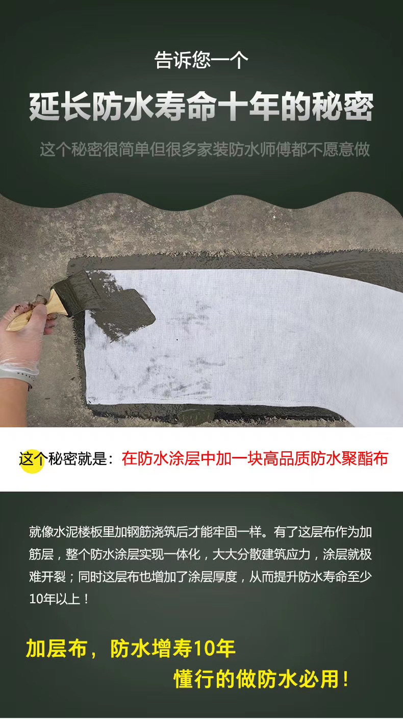 在防水涂層中加一層高品質(zhì)縫織聚酯布就像水泥樓板里加鋼筋澆筑后才能牢固一樣。有了這層聚酯布作為加筋層,整個(gè)防水涂層實(shí)現(xiàn)一體化,大大分散建筑應(yīng)力,涂層就極難開裂;同時(shí)這層聚酯布也增加了涂層厚度,從而大大提升防水壽命至少10年以上。