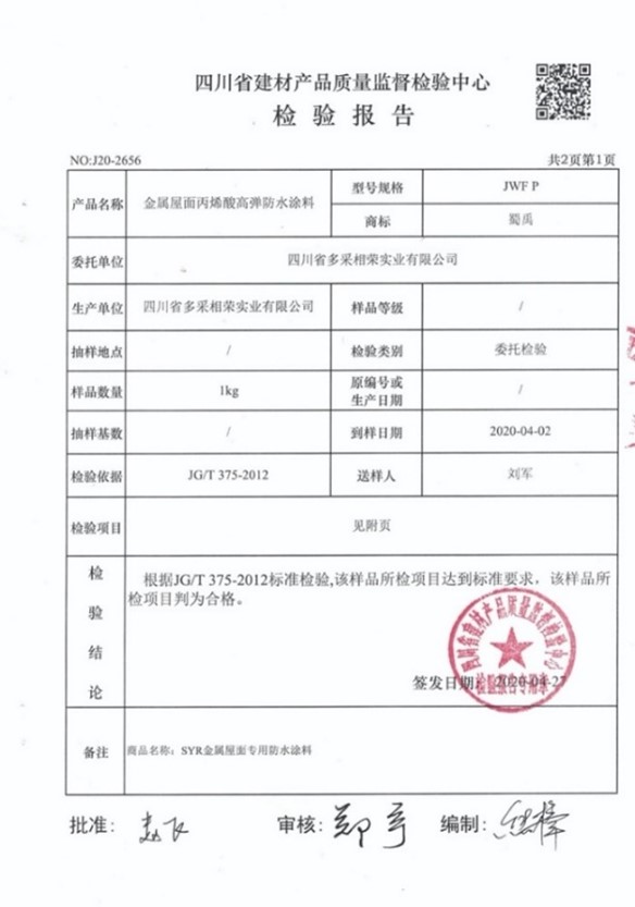 蜀禹SYR金屬屋面專用防水涂料系統主要是以高品質純丙烯酸乳液為主、添加優質改良化學成分及高分子聚合物精制而成的一種高性能高交聯的水性單組份高彈耐候性防水涂料,施工時輔之以專用縫織聚酯布而形成的無縫防水系統(聚合物聚酯胎現場成型高分子防水卷材)。該防水系統性能穩定優越,具有很強的密閉性、粘結力、抗拉伸強度、耐老化、抗腐蝕、抗疲勞、低溫柔性和優異的彈性。有效阻止外部因素對屋面的破壞。產品為水性、無味、不燃、無腐蝕屬環保型。該系統能與各種不同材質基面緊密結合牢固地粘結在一起形成一個堅固而有彈性的防水層,是裸露屋面防水材料的優選。