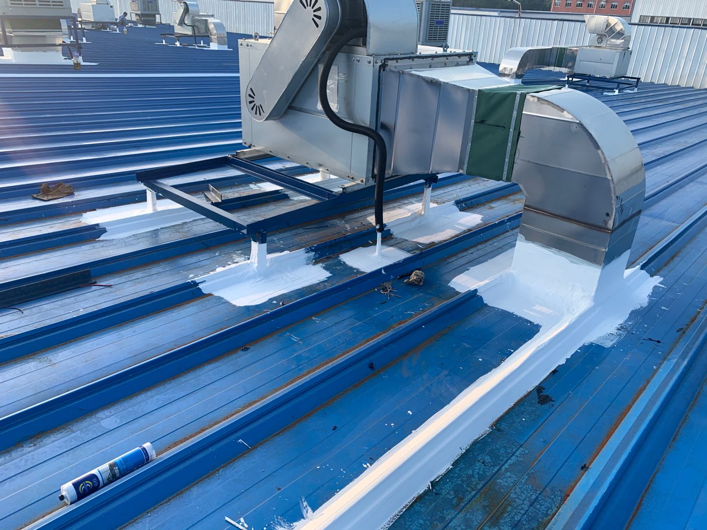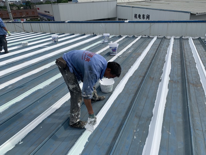 其次,進行基面的處理,如果彩鋼屋面表面有生銹的地方,先用免除銹納米固銹劑進行固銹處理,然后再進行防水涂料的涂膜施工。