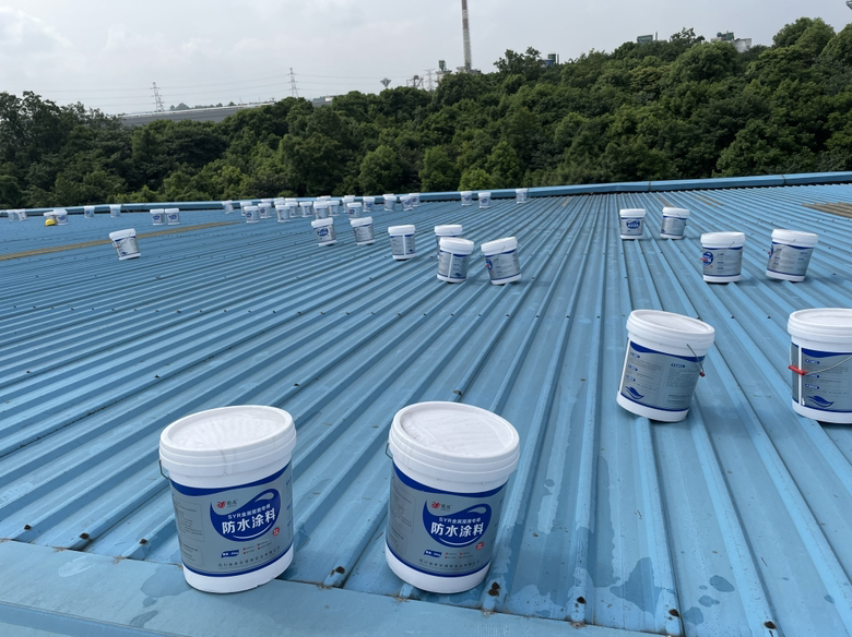 我公司根據現場實際情況,制定的方案是,采用SYR金屬屋面專用防水涂料配合專用的縫織聚酯布,涂刷多遍SYR金屬屋面專用防水涂料并中間鋪設聚酯布的方式進行防水施工,采用此工藝施工的防水工程是專門針對彩鋼頂的外露型屋頂的方式,SYR金屬屋面專用方式涂料施工后具有防水、反射隔熱降溫、耐酸性腐蝕、耐氣候老化多種功能。表面無需做保護層依然可確保防水層的耐久使用壽命。