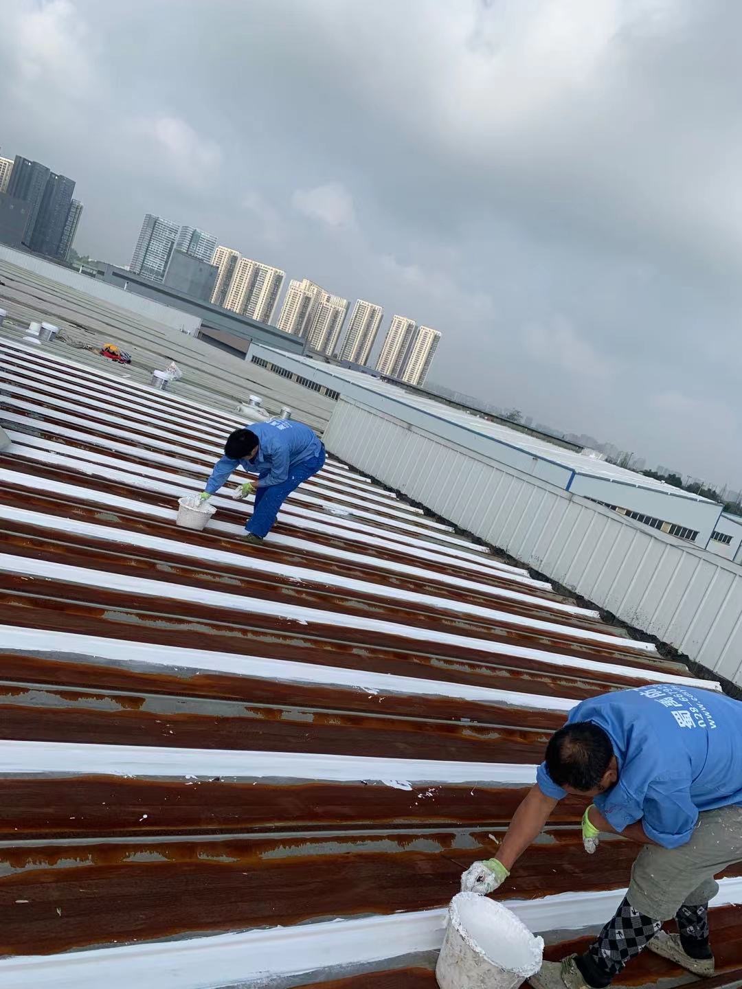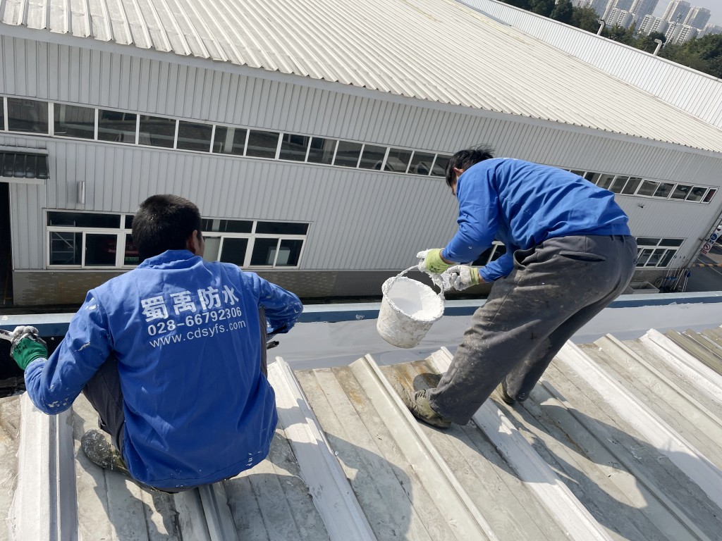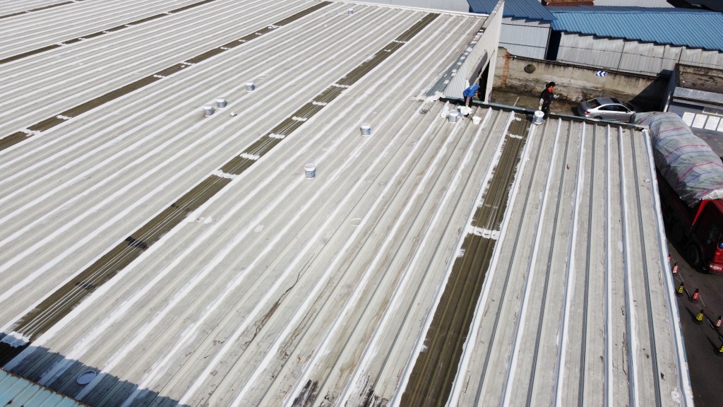 啟陽汽車華陽園區(qū)豐田鈑金車間與美容區(qū)及洗車區(qū)彩鋼頂防水工程由成都蜀禹建筑防水工程有限責(zé)任公司2021年8月進(jìn)行施工,廠房為鋼結(jié)構(gòu)的彩鋼頂,彩鋼頂漏水點(diǎn)位較多,并且豐田接車雨棚位置一塊區(qū)域彩鋼頂表面生銹了,先針對(duì)彩鋼頂進(jìn)行防水處理之后此處還對(duì)彩鋼表面滿涂SYR金屬屋面防水系統(tǒng)進(jìn)行防銹施工。此次針對(duì)此廠房頂部采用蜀禹SYR金屬屋面專用防水涂料配合專用縫織聚酯布進(jìn)行施工處理,處理后經(jīng)多次下雨檢驗(yàn)驗(yàn)收合格。