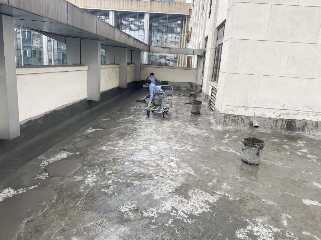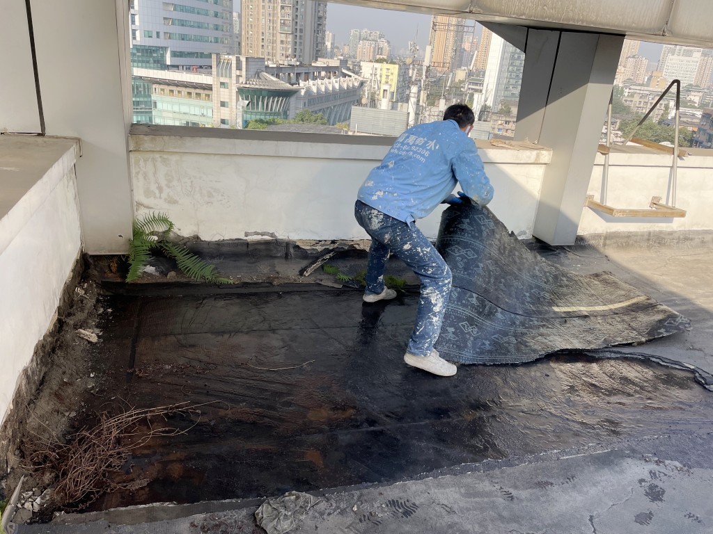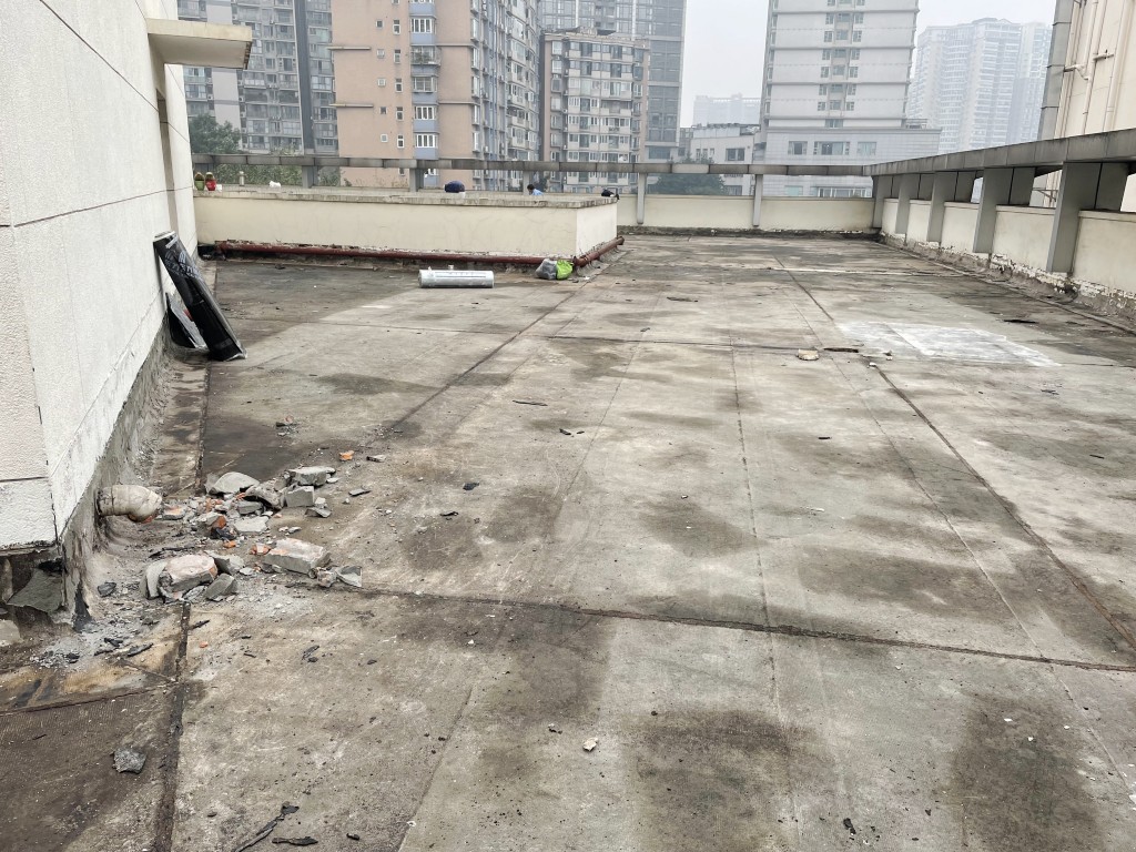我公司承接的四川省人民代表大會常務委員會2號樓4樓裙樓屋面及8樓屋頂防水工程與2021年11月施工完成并經過驗收合格,工程概況是我公司先實際查勘的屋面實際現場情況為,部分屋面為房屋修建時剛性屋面,4樓裙樓部分屋面在原有地面的基礎之上,后來又做了一層改性瀝青防水卷材,但是現在樓下屋頂還是有漏水點存在,這種現象分析原因是由于:屋頂本身有保溫層,保溫層是不防水的,水可以在保溫層內到處竄,屋頂表面的防水卷材一些地方由于老化出現開裂的情況,水從表面裂縫位置滲入防水卷材下面,由于改性瀝青防水卷材底下與地面并沒有完全粘貼,水到了防水卷材底下之后就會向四周擴散,導致防水卷材底下到處都是水,水擴散到防水卷材下面的地面有問題的地方時,再滲漏到保溫層內,最后從屋頂現澆板有薄弱的部位滲漏到樓下去了<注:屋頂現澆板本身是混凝土澆筑的,現澆板一般本身不會透水,但是現澆板澆筑時由于一些原因個別地方沒有澆筑好,水就會從那些沒澆筑好的薄弱部位漏到樓下,所以綜合上述原因分析,導致室內屋頂滲水的水的來源可能并不是正對位置屋頂表面,可能是其他部位表面出現滲漏,然后竄水過來的。(我公司采取的方式是不將屋頂的表面剛性層全部拆除和將保溫層掏出,只需要將目前室內漏水的位置對應的屋頂位置局部敲開,先進行局部堵漏修補處理,然后從局部敲開的位置以及將下水口位置敲開,從這些位置將屋頂保溫內的多余積水清理掉即可,不用全部敲開這樣可以減小工程量,縮短施工工期,并且不會對對房屋的使用造成太大的影響,全部敲開的話往樓下搬運的建渣特別多,地面建渣堆放影響環境,并且施工周期大大延長,影響樓內辦公人員工作,如果全部敲開時恰逢下雨的話,室內將漏水區域大大增加,造成室內短時間增加多處漏水情況,這樣會對室內辦公造成更加嚴重的影響,故我公司只是局部敲開堵漏,從局部敲開的地方將多余的積水清理排出即可。)