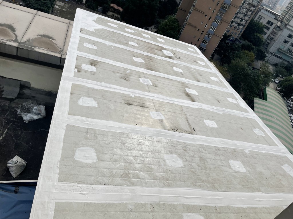 8樓屋頂搭建的三間小的彩鋼頂漏水情況是,彩鋼頂表面的彩鋼搭接縫及螺絲釘漏水,雨水從那些縫隙滲漏到室內了,處理方法采用蜀禹SYR金屬屋面專用防水涂料配合專用縫織聚酯布進行防水施工處理,先針對彩鋼搭接縫以及彩鋼與墻體交接縫進行一布三涂防水處理,然后再整個彩鋼頂表面滿涂刷SYR金屬屋面專用防水涂料。