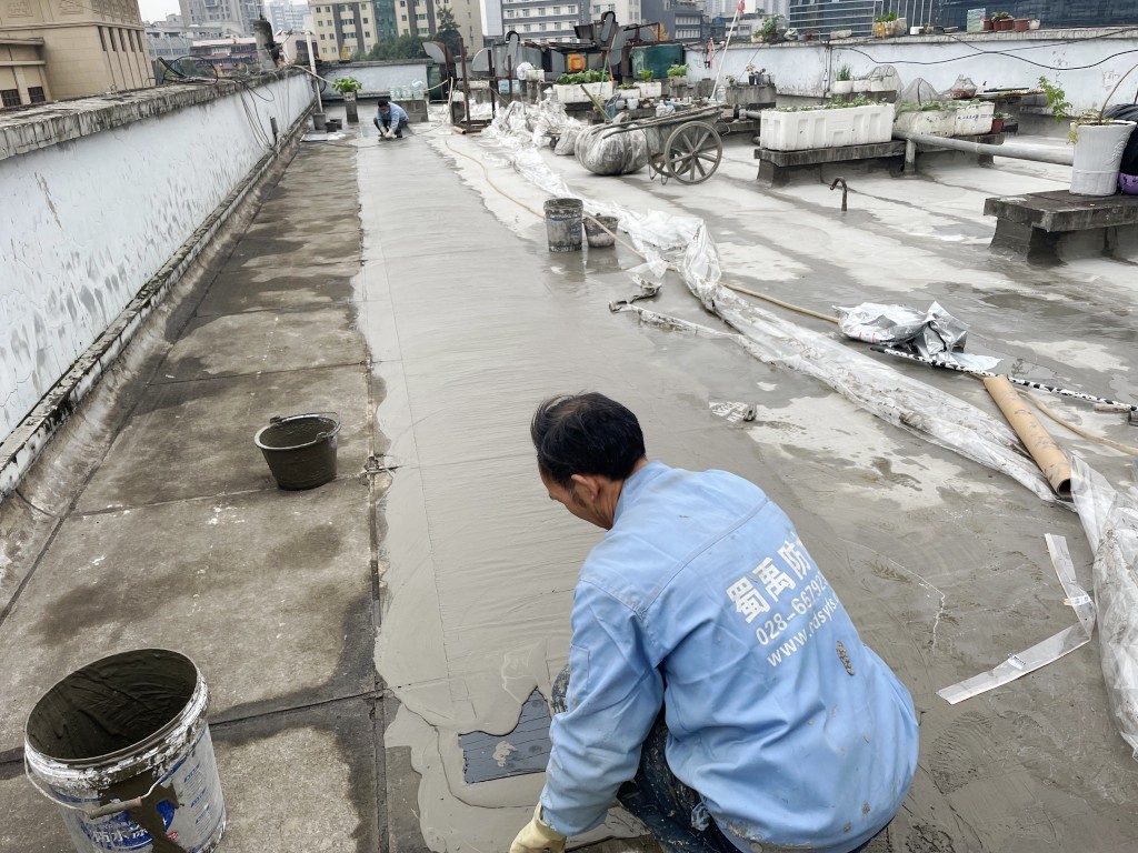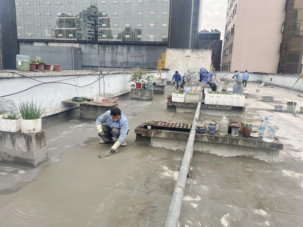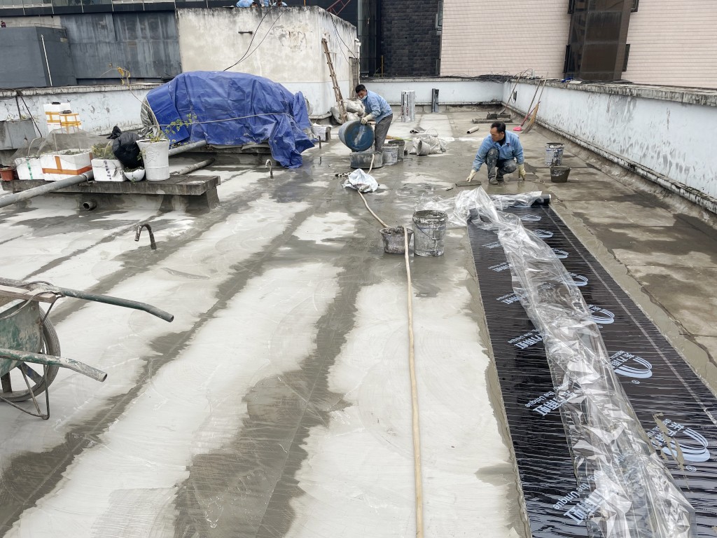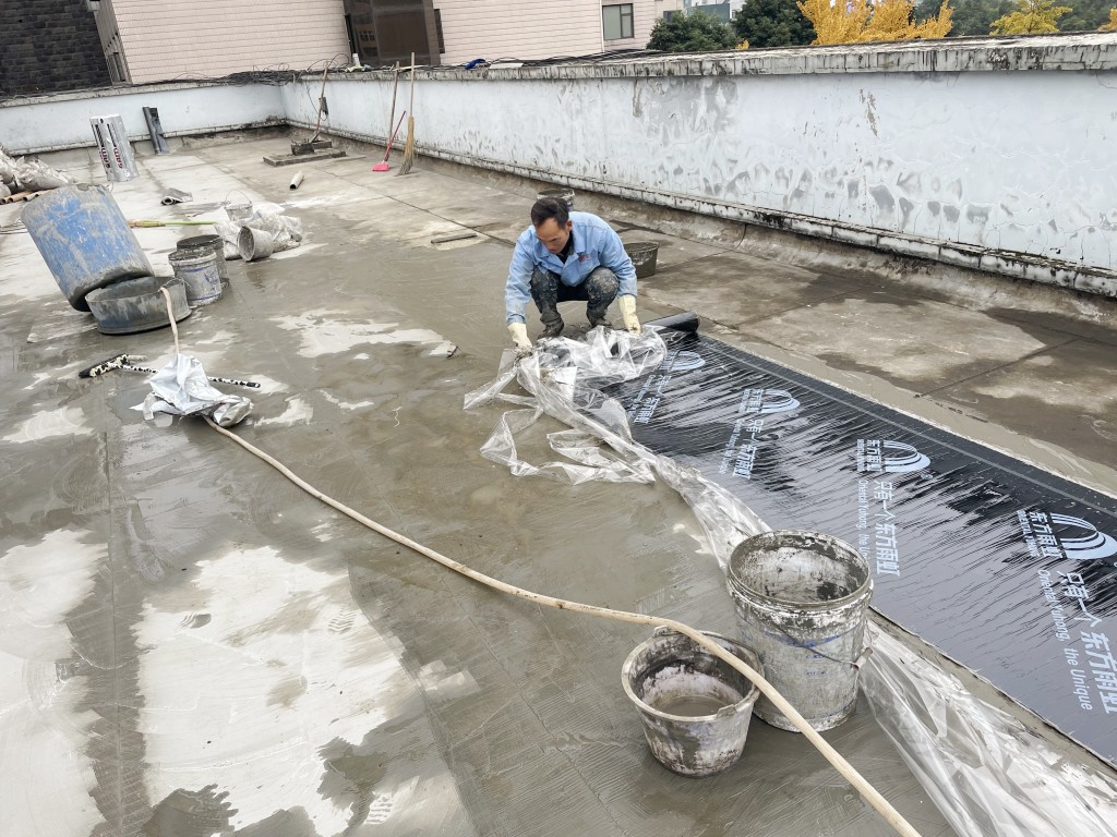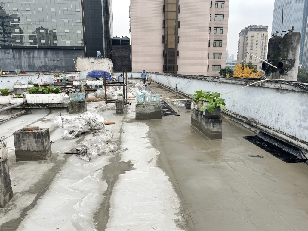 我公司采取的施工方案為:先將地面原有改性瀝青防水卷材清理掉,然后在地面及墻面滿鋪一層濕鋪防水卷材(濕鋪防水卷材可避免水在防水卷材底下到處竄的情況),防水卷材施工后在表面做一層砂漿保護(hù)層蓋住防水卷材,讓防水卷材免受紫外線照射,延長(zhǎng)防水卷材壽命,最后將施工產(chǎn)生的建渣搬運(yùn)下樓并清運(yùn)出場(chǎng)。