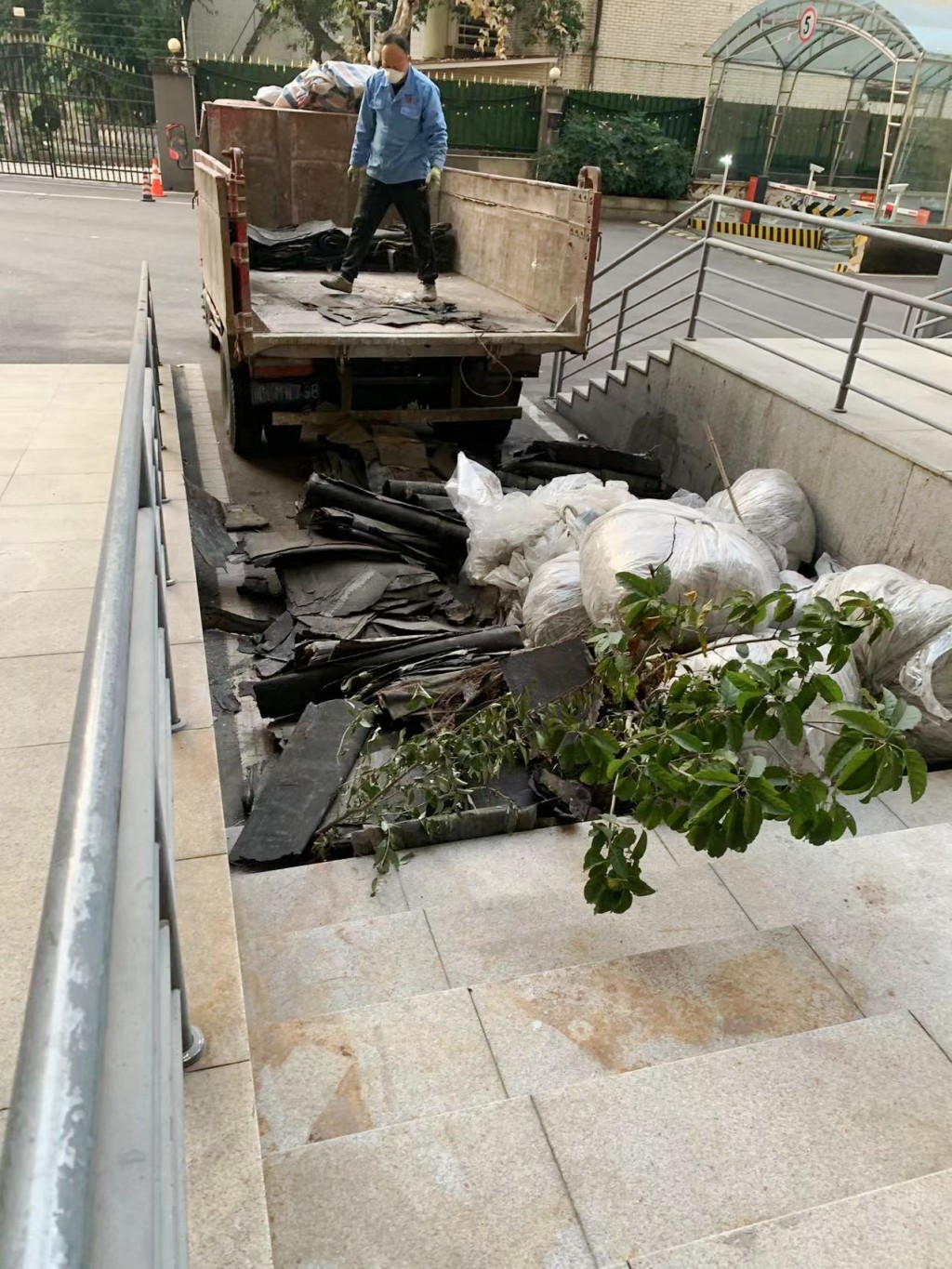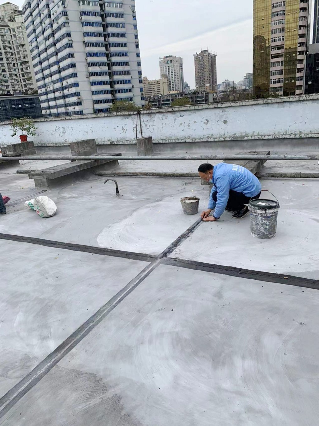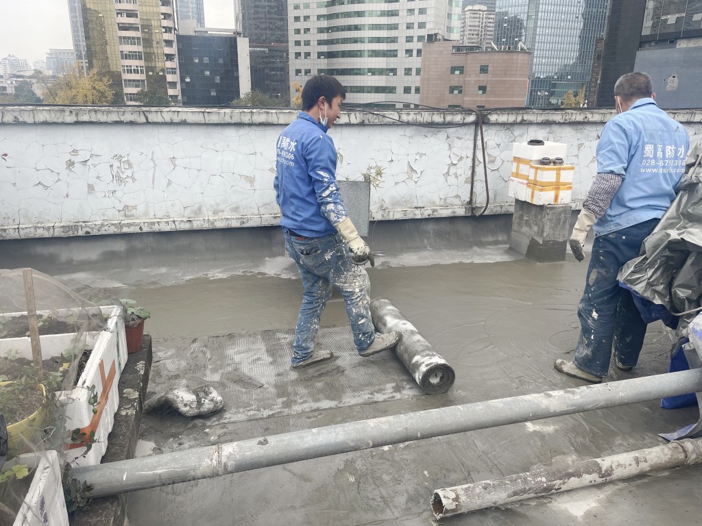我公司采取的施工方案為:先將地面原有改性瀝青防水卷材清理掉,然后在地面及墻面滿鋪一層濕鋪防水卷材(濕鋪防水卷材可避免水在防水卷材底下到處竄的情況),防水卷材施工后在表面做一層砂漿保護(hù)層蓋住防水卷材,讓防水卷材免受紫外線照射,延長(zhǎng)防水卷材壽命,最后將施工產(chǎn)生的建渣搬運(yùn)下樓并清運(yùn)出場(chǎng)。