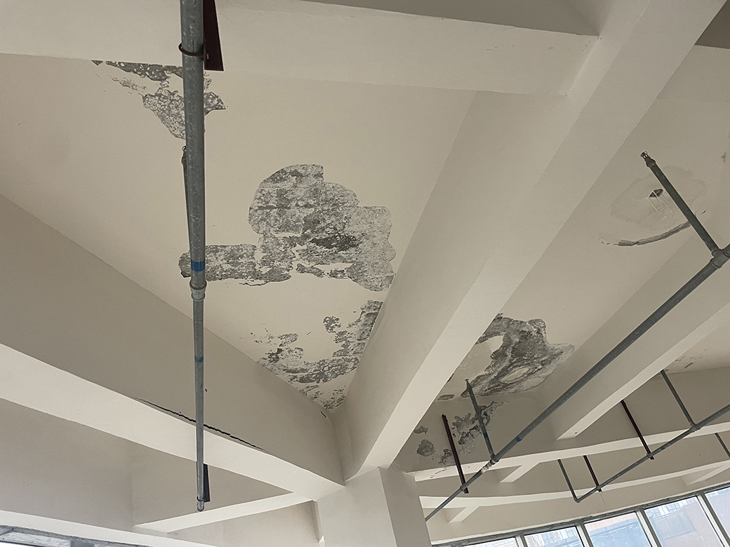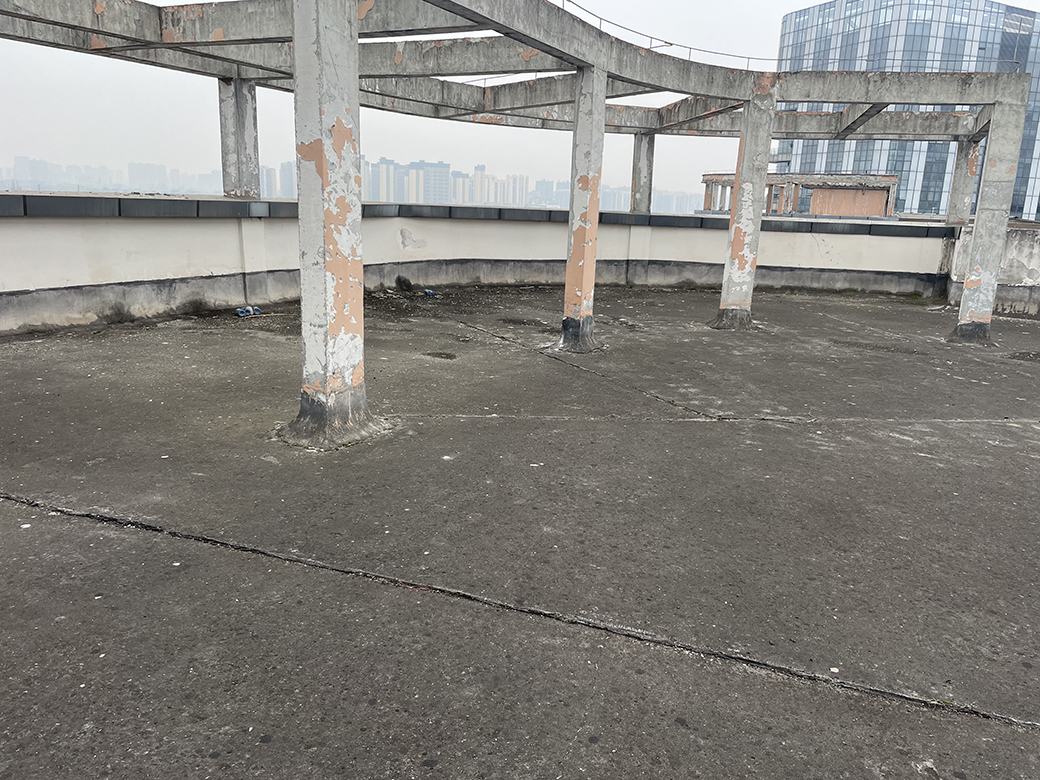 屋頂未施工之前,屋頂表面的保護(hù)層已經(jīng)翻砂起殼,個(gè)別地方鋼筋都已經(jīng)露出