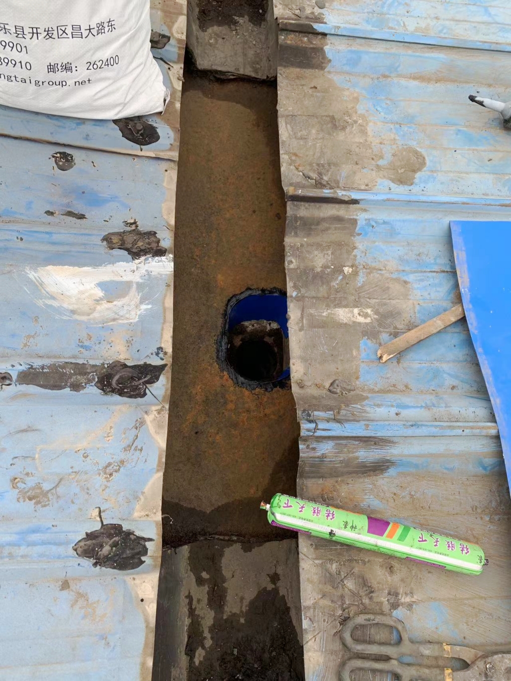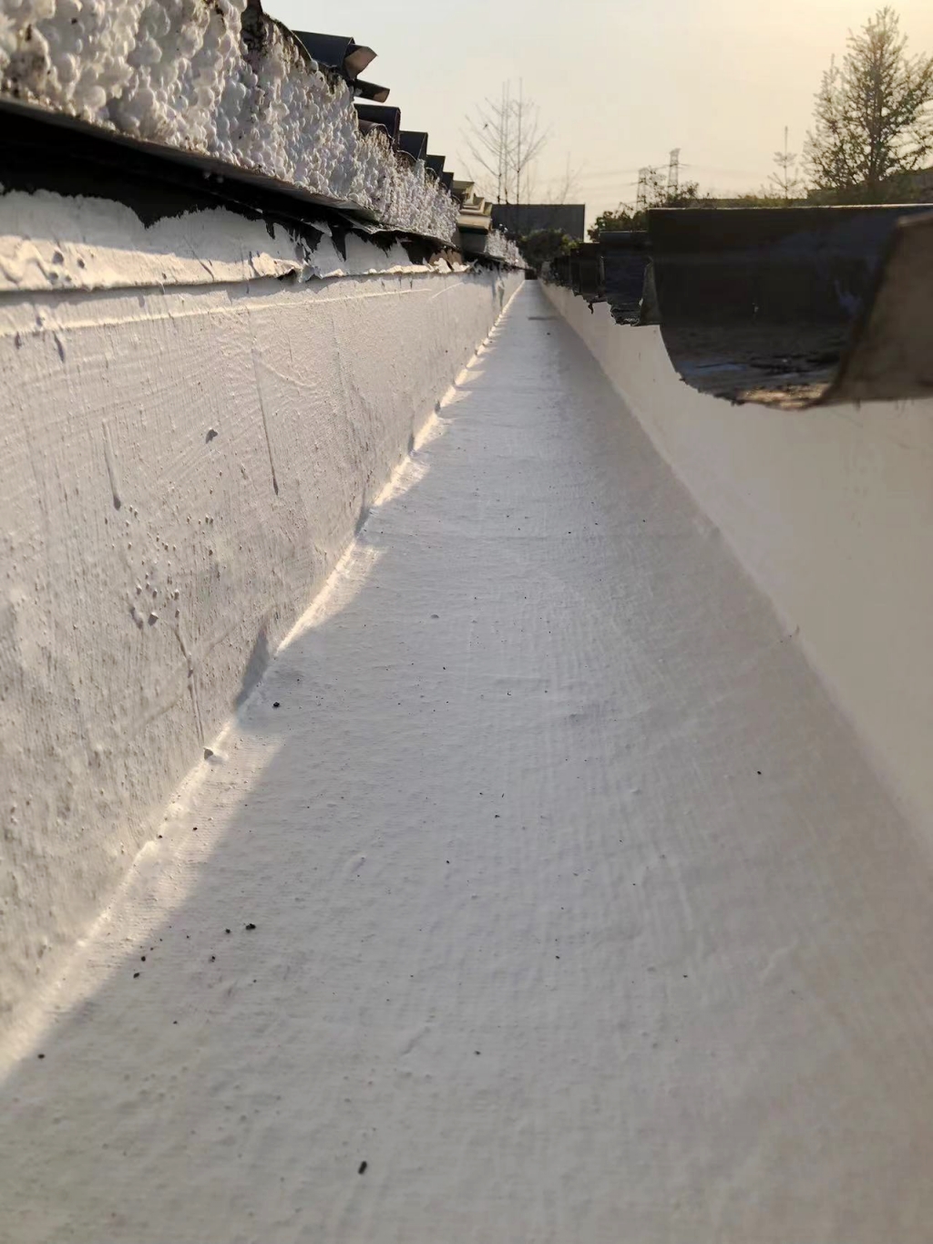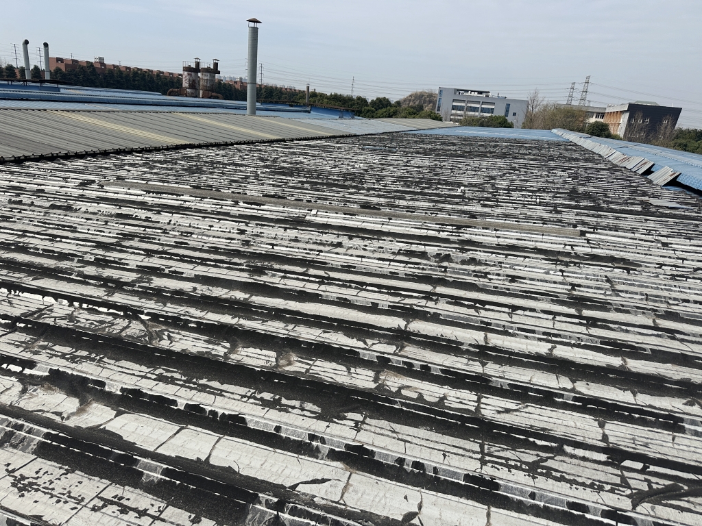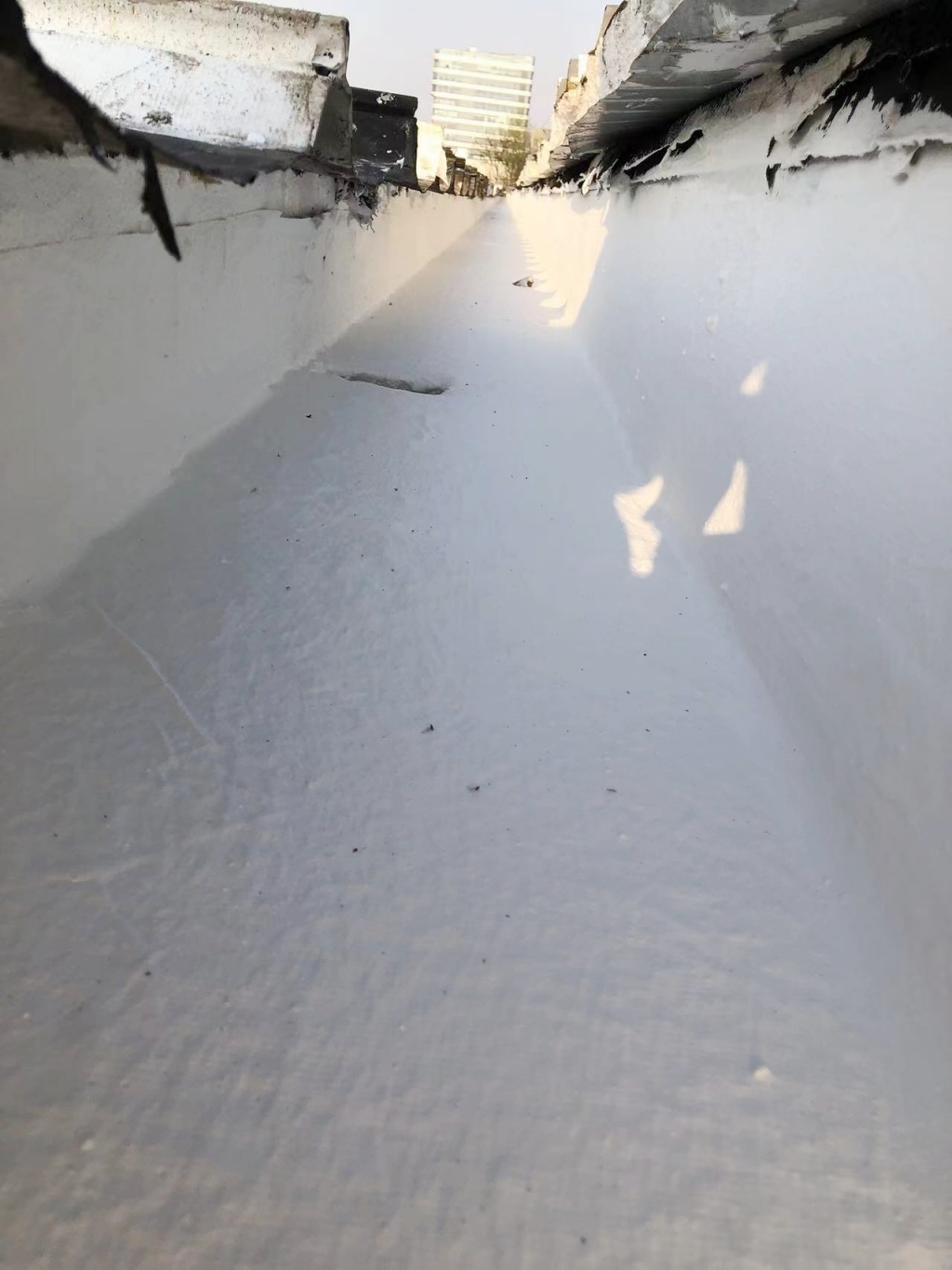 在施工過程中,公司技術(shù)團隊首先揭掉了天溝內(nèi)的瀝青防水卷材,發(fā)現(xiàn)下方天溝已經(jīng)銹蝕嚴重,出現(xiàn)了多處穿孔。針對這一問題,團隊先對天溝進行了除銹處理,并涂刷了免除銹納米固銹劑,有效阻止了銹蝕的進一步發(fā)展。隨后,團隊在天溝內(nèi)涂刷了SYR金屬屋面專用防水涂料,并鋪貼了專用縫織聚酯布,以增強防水層的韌性和耐久性。最后,再在天溝表面涂刷了兩遍SYR金屬屋面專用防水涂料,確保防水效果達到**。