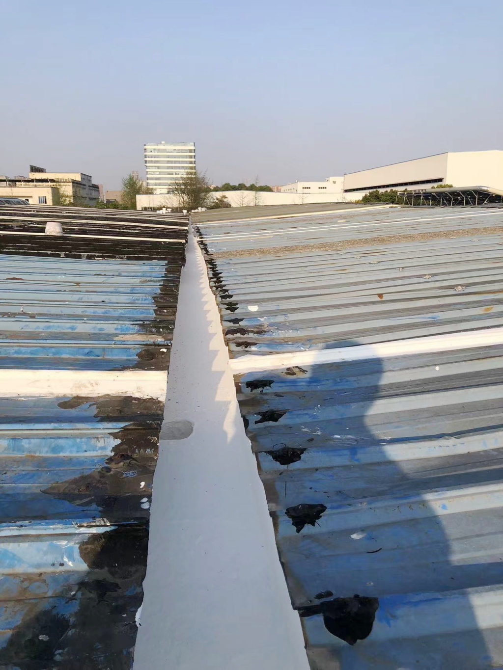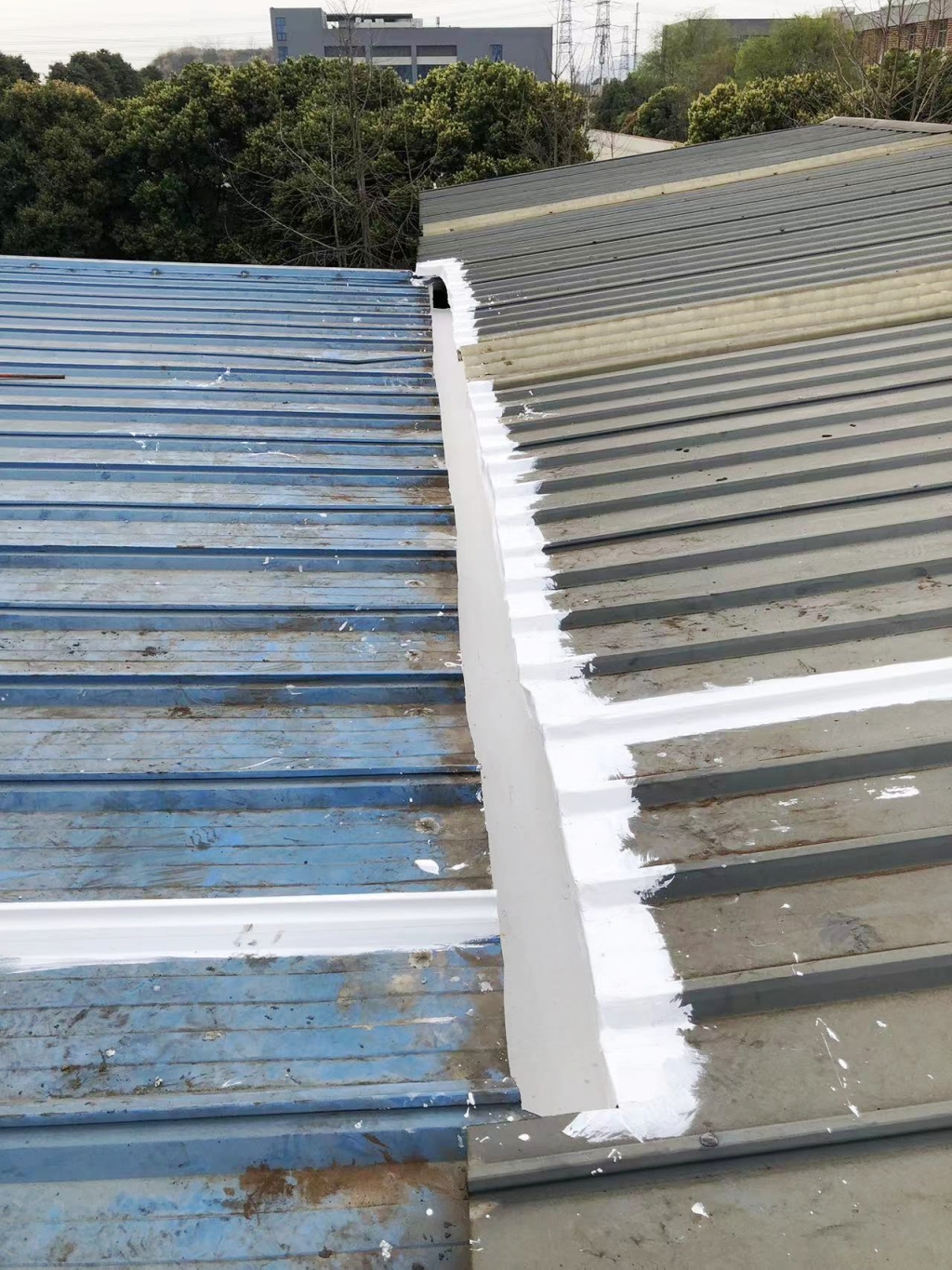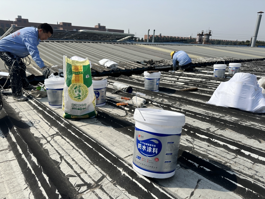 對于彩鋼頂斜坡表面彩鋼搭接縫的漏水問題,公司同樣采用了SYR金屬屋面專用防水涂料配合專用縫織聚酯布進行一布三涂的施工處理。這種施工方法不僅能夠有效密封搭接縫隙,防止水分滲透,還能夠提高彩鋼頂?shù)恼w防水性能。
