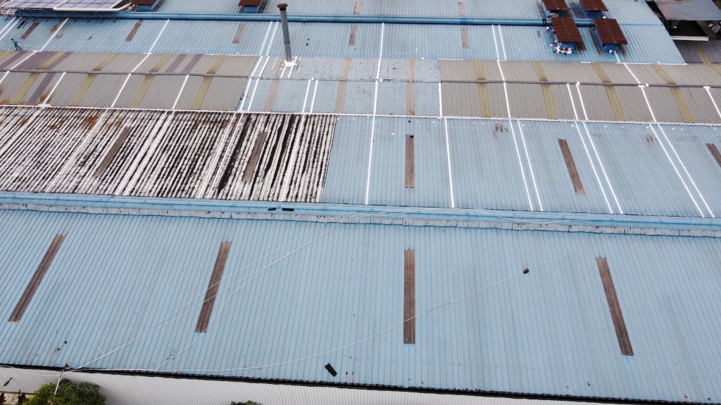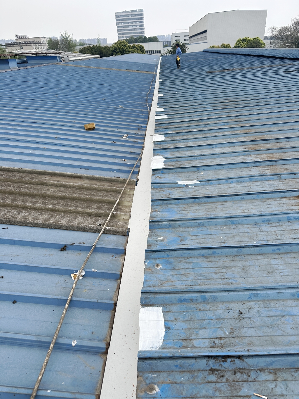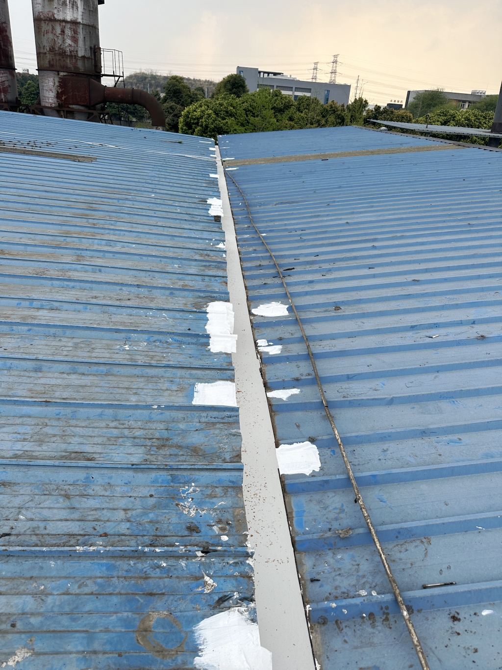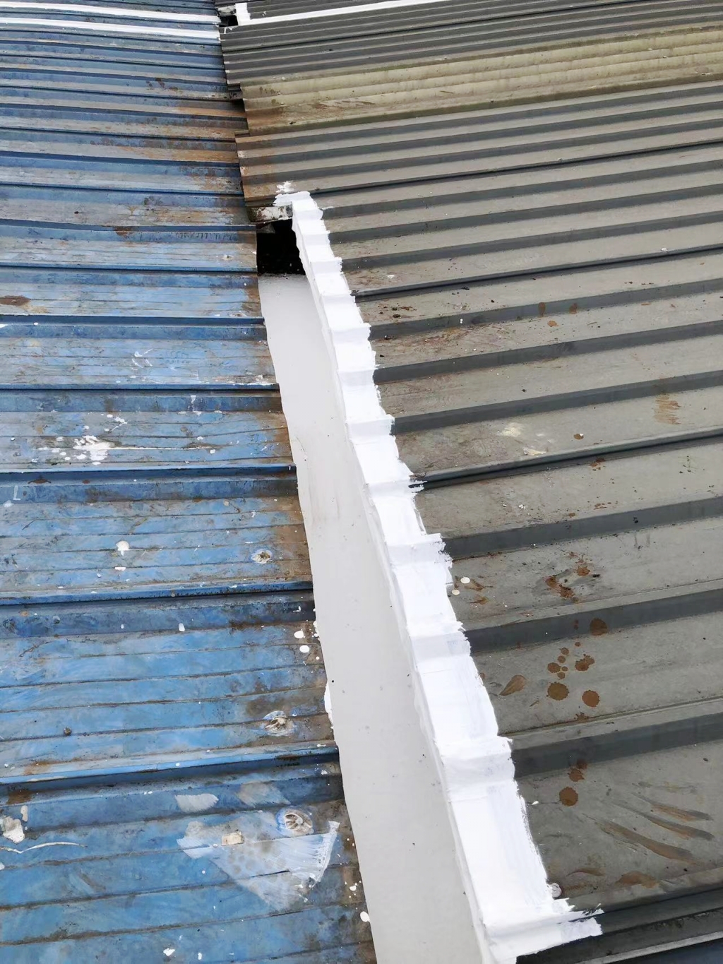 對于彩鋼頂斜坡表面彩鋼搭接縫的漏水問題,公司同樣采用了SYR金屬屋面專用防水涂料配合專用縫織聚酯布進行一布三涂的施工處理。這種施工方法不僅能夠有效密封搭接縫隙,防止水分滲透,還能夠提高彩鋼頂?shù)恼w防水性能。