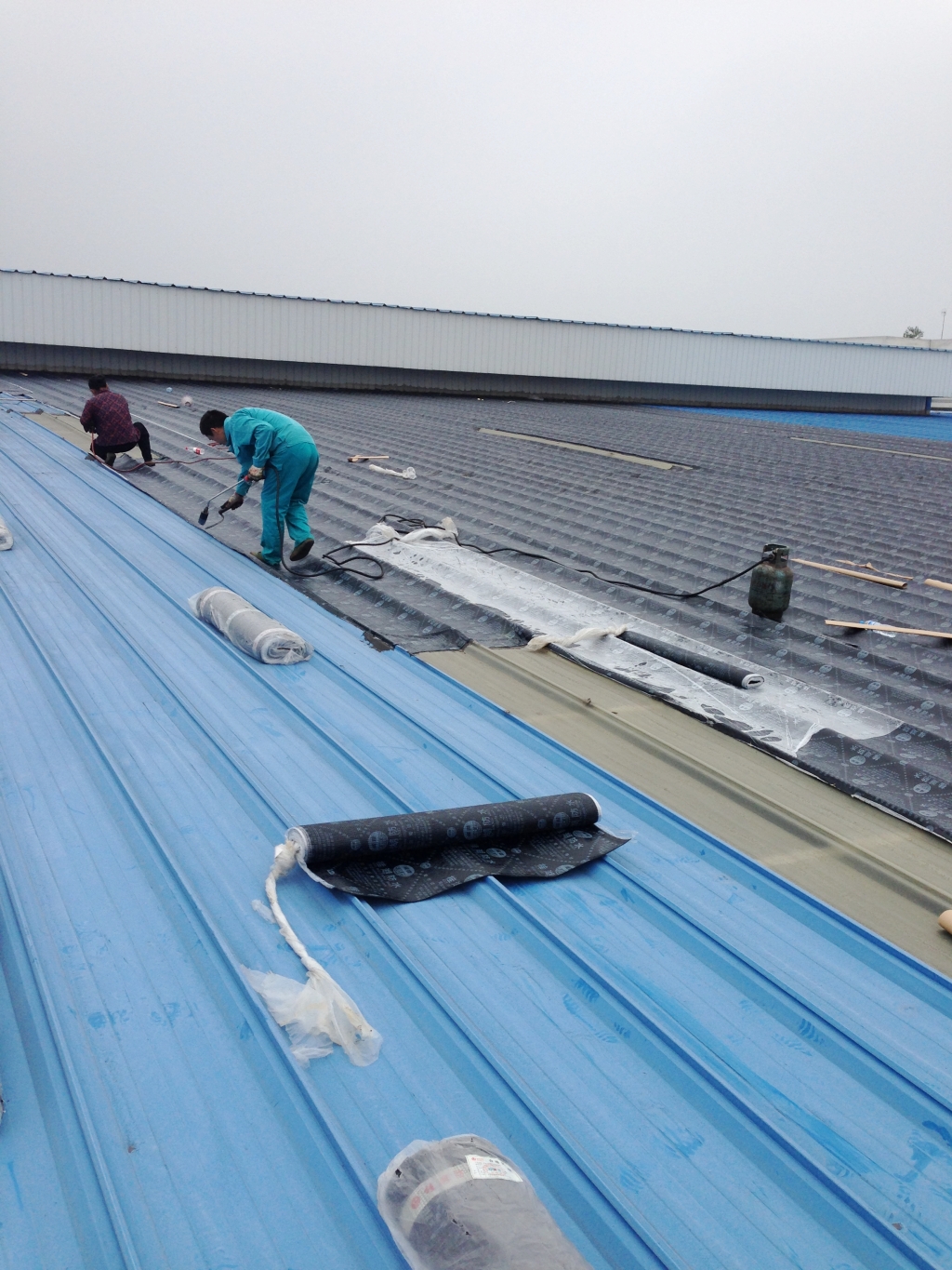 彩鋼瓦屋頂經過幾年的風吹雨打,表面油漆容易掉落,油漆掉落后表面很快就會出現銹跡斑斑,個別地方彩鋼瓦就會銹穿孔,導致漏水,滿鋪一層改性瀝青防水卷材,不但能夠起到防水作用,而且保護了彩鋼瓦,使彩鋼瓦的使用壽命延長,所以此工程我們采用漏水區域頂全全做一層SBS改性瀝青防水卷材的方法。