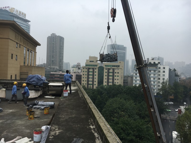 四川省人大常委會辦公廳1號樓會議室屋頂防水為我公司采用國標一型PET濕鋪防水卷材施工,會議室屋頂以前修建的時候采用的改性瀝青防水卷材施工,由于個別局部位置沒有處理好,水漏到了防水卷材底下去,水在防水卷材底下到處竄水,導致了會議室頂部多處漏水嚴重,后面其他單位給他們維修時又還是采用了改性瀝青防水卷材施工,但是施工后由于屋頂上局部地方有空調設備等不是很好施工,防水卷材施工后還是漏水,最終我公司給制定了采用國標一型PET濕鋪防水卷材的施工方案,先局部試驗,后經檢驗認可最終確定我公司對四川省人大常委會辦公廳1號樓會議室屋頂采用國標一型PET濕鋪防水卷材施工,施工后效果非常理想。