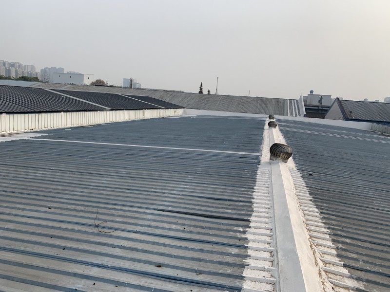 四川省歐朗仕汽車配件有限責任公司彩鋼頂廠房位于成都市雙流區羅漢路,此次處理的廠房為廠區內一、二、四、五、六、七、住宿樓的屋頂防水,彩鋼頂漏水情況以前表現出的現象是,在室內看到是兩邊靠近水溝的位置,下雨的時候從水溝位置漏水下來,后來將水溝全部進行防水處理了,結果下雨的時候還是漏水,搭著梯子仔細檢查才發現,彩鋼頂頂部的個別縫隙也在漏水,水從彩鋼頂斜坡上面漏水到了彩鋼瓦的夾層中,水在夾層中順著斜坡流至斜坡底端才漏下來,結果就是從靠近水溝的位置漏下來,如果不搭著梯子的話,從下面遠遠觀看,就以為是水溝在漏水,后來將漏水位置的上面斜坡部位彩鋼接縫進行防水處理了,再下雨就沒有漏水現象發生了,所以由于彩鋼頂的特殊性,水可能會在彩鋼頂斜坡內順著下滑至底端靠近水溝位置漏水,所以處理彩鋼頂漏水一般要將漏水位置對應的上面斜坡位置都進行防水處理才行。
